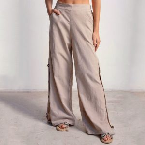 Women's Pants Trousers Summer Wide Leg Cotton Linen Palazzo Pants Baggy Loose Fit with Pockets