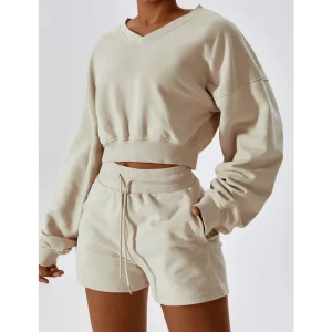 Cotton Quarter Zipper Women's Hoodies Sweatshirts Crop Hoodie Shorts Set